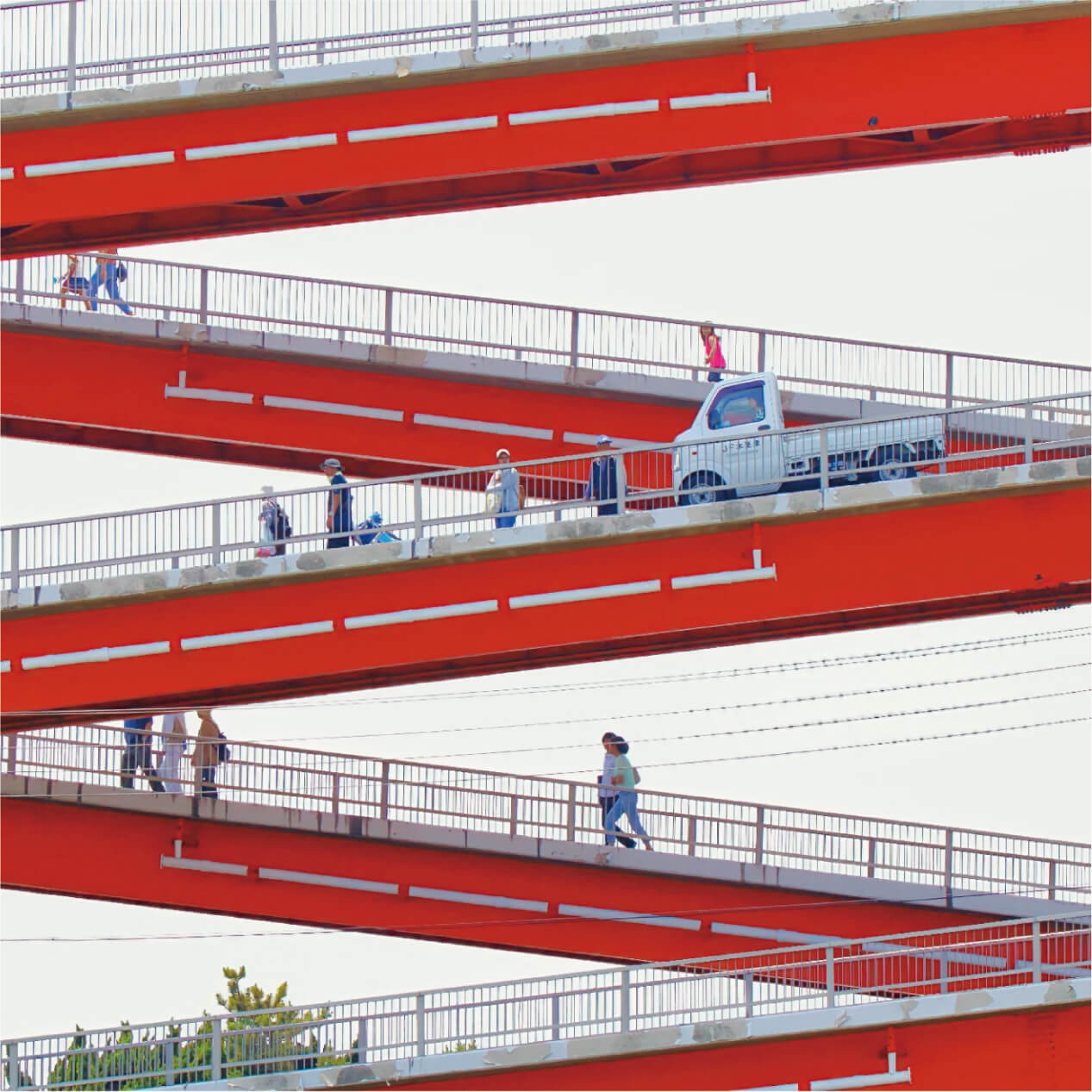 赤い鉄の橋桁の階層がリズミカルに重なり、鋼構造の力強さと人々の日常の営みが美しく調和しています。行き交う人々の楽しげな会話が聞こえてきそうです。